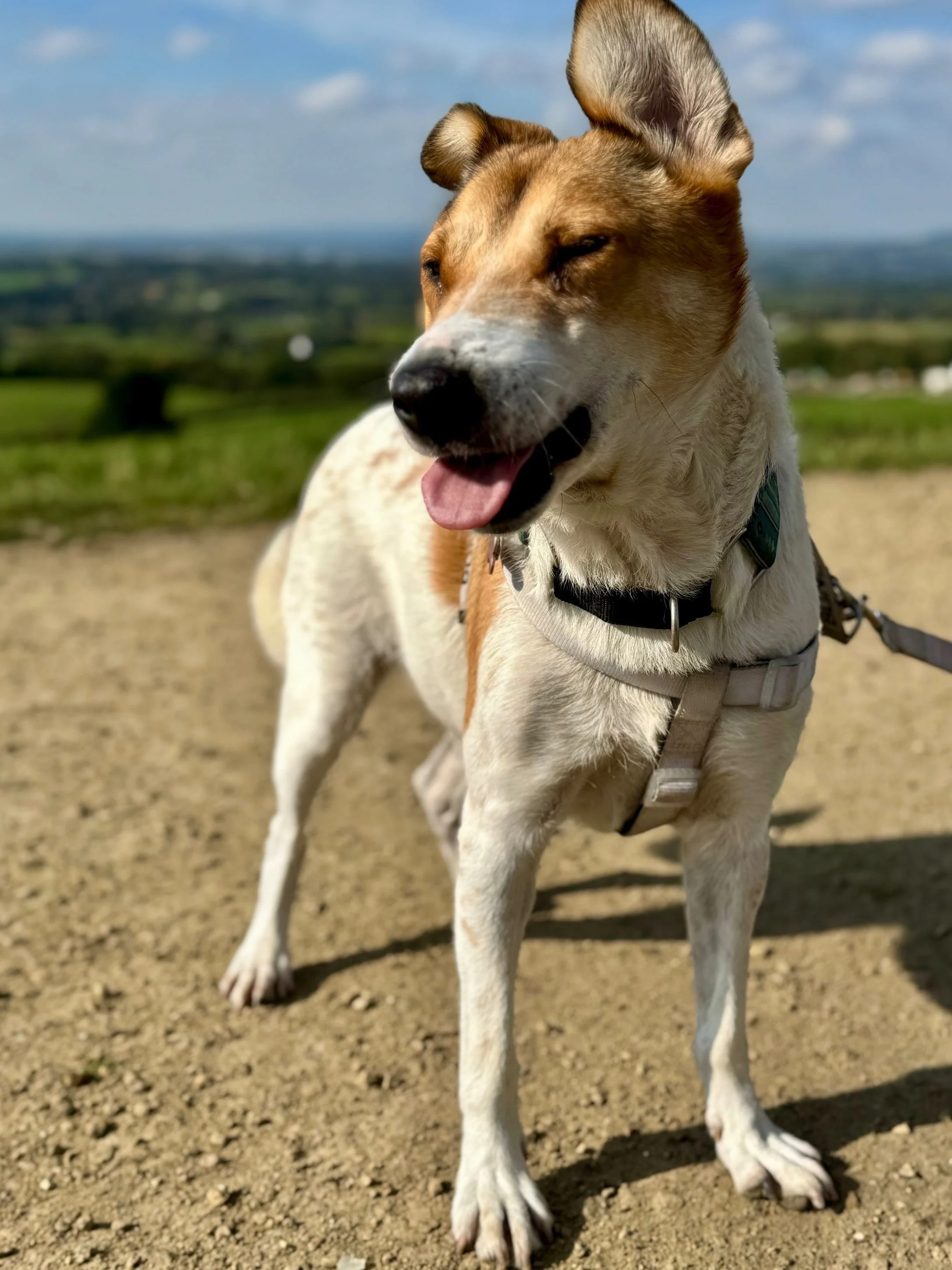 Alfie is a beautiful rescued girl that in early life was rendered blind and deaf through mistreatment by former owners. We have managed to get her confidently joining group walks and in spite of her additional needs, she loves being a part of the pack.